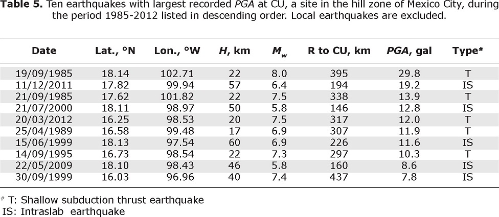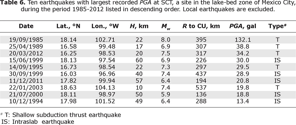 Table 6 is similar to Table 5 but for SCT. PGA at SCT during the 2012 earthquake was 34 gal, which is the third largest in the table. Annual exceedance rate of 20 gal at this site is about 0.3. During five out of the 10 events the PGA at SCT was between 29 and 39 gal. Again, the PGA at SCT during the 2012 earthquake was not exceptionally large (roughly four times less than during 1985 earthquake).
