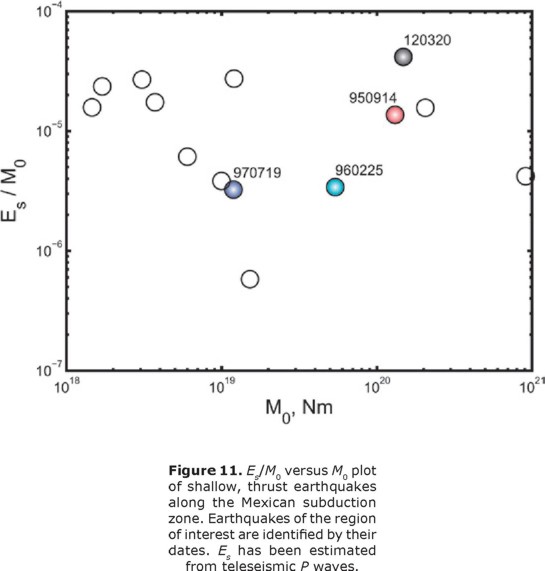 Seismic moment, M0, and radiated seismic energy, Es, are the two basic source parameters of an earthquake. We computed Es of five recent, large, earthquakes in the region using teleseismic P-wave recordings following the method of Boatwright and Choy (1986). The estimate of the energy flux was obtained from the integral of the squared velocity spectrum of the P-wave group (P, pP, and sP waves), corrected for attenuation and site effect (Pérez-Campos, 2002; Pérez-Campos et al., 2003). The total P-wave energy was then estimated using covariance-weighting least squares (Pérez-Campos and Beroza, 2001), and correcting for geometrical spreading and radiation pattern. We used q = 15.58 (Boatwright and Choy, 1986), the partitioning between S- and P-wave energy, to estimate the total radiated seismic energy. Table 4 lists Es and Es/M0 values of the 2012 and other earthquakes in the region. We note that Es/M0 of the 1996 and 1997 earthquakes, both located off-shore, near the trench (Figure 1), are an order of magnitude smaller than for the other three events which broke the plate interface further downdip (Figure 11). These earthquakes, like some other events near the trench of the Mexican subduction zone, also gave rise to unusually low PGA (Iglesias et al., 2003). Low Es/M0 is typical of near-trench earthquakes (e.g., Lay et al., 2012).