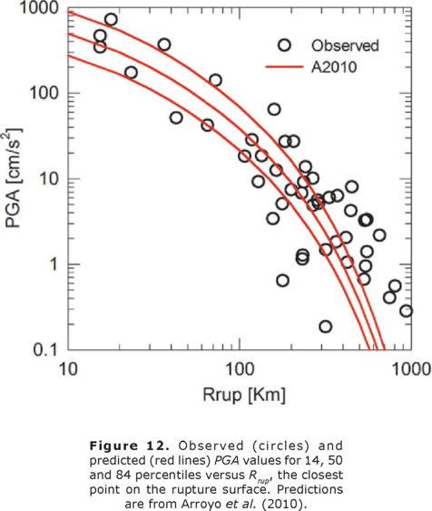The recordings from the 2012 earthquake permit a check on the GMPE for interface earthquakes (Arroyo et al., 2010). Figure 12 shows plots of observed and predicted PGA at hard sites as a function of Rrup, the closest distance from the site to the rupture area. Here PGA = [(An 2 + Ae 2)/2]1/2 (An and Ae are the peak accelerations on NS and EW components, respectively). The predictions are reasonable for Rrup < 400 km, beyond which they underestimate the observations. This is expected since only data at distances of Rrup < 400 km were used by Arroyo et al. (2010) in the regression analysis. In any case, ground motions at such large distances are of little importance in earthquake engineering.