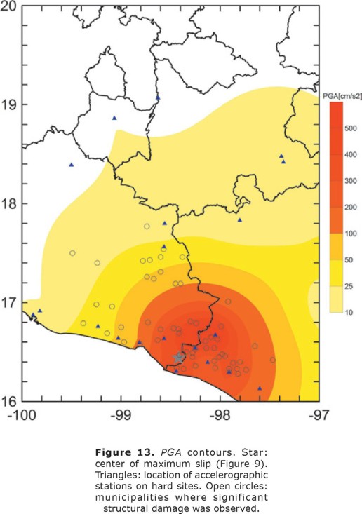 Figure 13 shows PGA contours in Mexico for the 2012 earthquake. These contours were obtained from recorded data (shown by triangles) using a Bayesian interpolation technique. We note that the maximum contour roughly coincides with the maximum slip on the fault (Figure 9). Figure 13 also shows municipalities where significant structural damage was observed. These municipalities received federal funds for recovery and reconstruction of the affected population (http://dof.gob.mx/nota_detalle.php?codigo=5241891&fecha=03/04/2012; http://dof.gob.mx/nota_detalle.php?codigo=5241892&fecha=03/04/2012).