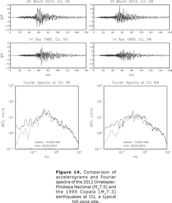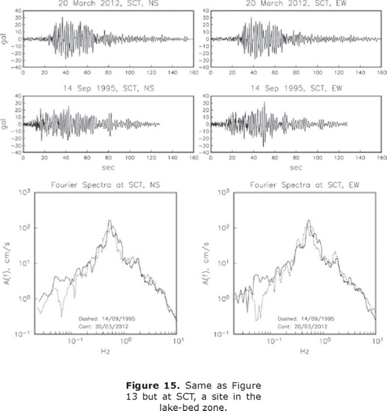 The 2012 earthquake was strongly felt in Mexico City. Initially it was thought that the city had survived well the onslaught of the largest earthquake since 1985. Figure 14 compares accelerograms and Fourier spectra of the 2012 (Mw7.5) and the 1995 Copala (Mw7.3) earthquakes at CU, a hill-zone site in city. Figure 15 illustrates the corresponding plots at SCT, a site in the lake-bed zone. The distance from the two sources to Mexico City is roughly equal. The PGAs during the two earthquakes at each of these sites are nearly the same (Table 5 and Table 6). The same is true for Fourier amplitude spectra at frequencies greater than about 1 Hz. At lower frequencies, the Fourier amplitudes of the 2012 earthquake are somewhat greater than of the 1995 event, in agreement with their relative moment magnitudes.