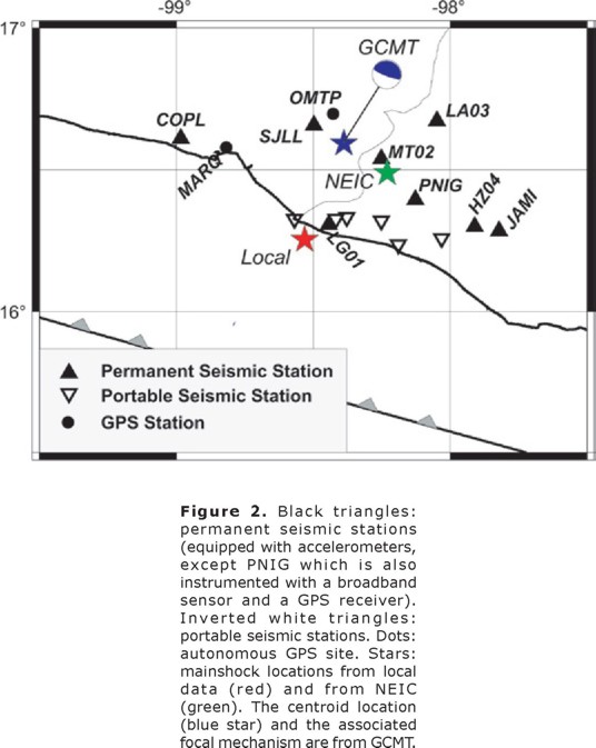 The earthquake was recorded in the epicentral zone at Pinotepa Nacional station (PNIG) which is equipped with a broadband seismograph, an accelerograph, and a GPS receiver with a sampling interval of 1 s (Figure 1). This station is operated by the National Seismological Service (SSN, Servicio Sismológico Nacional) of Instituto de Geofísica, Universidad Nacional Autónoma de México (UNAM). Data from PNIG are transmitted in real-time to Instituto de Geofísica, UNAM. There were several accelerographs in and near the epicentral zone (elements of seismic alert systems for Mexico City and tye City of Oaxaca) which produced strong-motion recordings. There were also a few GPS stations in the area, operating in an autonomous mode, from which coseismic static displacement field could be retrieved. Following the earthquake, a portable network of seven seismic stations was installed in the epicentral area to record aftershocks. At regional distances, the earthquake was recorded by broadband seismographs and accelerographs. The even produced numerous accelerograms in the Valley of Mexico and the City of Oaxaca.