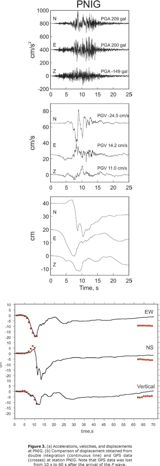 After a few seconds of recording, the data stream at PNIG was lost for ~ 4 hours. Much of the seismic data, including the mainshock accelerogram, were retrieved soon after communication was re-established. The broadband seismograms were clipped during the mainshock. Figure 3a shows acceleration, velocity, and displacement at PNIG (velocity and displacement were obtained from direct integration of the acceleration). The traces begin at the arrival of P wave. The displacements on NS, EW and Z components, 25 s after P-wave arrival, are - 9.0, - 8.0 and - 8.0 cm, respectively.