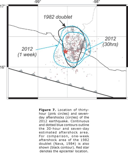 Figure 7 compares the aftershock areas of the 2012 earthquake estimated from 30-hour and seven-day activity, with tht of seven-day aftershock area of the 1982 doublet (Nava, 1984). The areas roughly overlap. However, the sum of moments of the doublet (5.6×1019 Nm, Astiz and Kanamori, 1984) is only about 1/2 to 1/3 of the momento of the 2012 earthquake (1.3×1020 to 1.98×1020 Nm). It is possible that the 2012 event broke an area which was larger than the doublet area but included it, suggesting a variable rupture mode (Kanamori and McNally, 1982).
