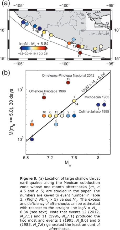 There was a general perception that the aftershocks activity following the 2012 earthquake was unusually intense. The number of aftershocks may be a reflection of the degree of heterogeneity on and near the fault plane. If there is a regional variation in the number of aftershocks then its knowledge is also useful to civil protection authorities. Thus, it is important to know whether the number of aftershocks of the 2012 event was truly large or only a subjective perception. The SSN network has been undergoing expansion and improvement. For this reason, it is not possible to compare the statistics of aftershocks of this earthquake with those of previous large events based on the SSN catalog. Therefore, we used U. S. Geological Survey Earthquake Data Base (http://earthquake.usgs.gov/earthquakes/eqarchives/epic/epic_rect.php). For our analysis, we isolated aftershocks of all shallow, thrust events with Mw ≥ 6.9 wich occurred along the Mexican subduction zone, from Jalisco-Colima to Oaxaca, beginning 1963 when the World-Wide Standard Seismograph Network became operational. The database lists body-wave magnitude, mb, of small and moderate earthquakes and Ms or Mw for large earthquakes. For many, recent moderate earthquakes Mw rather than mb is listed. For each earthquake we extracted seismicity during the next 30 days in an area which was chosen to be somewhat larger than the expected rupture area. Table 3 gives N(mb), where N is the number of events with magnitude ≥ mb. N is listed for mb = 4.5 and 5.0. The number includes the mainshock. Mw of moderate earthquakes is taken as mb. The catalog is probably complete for mb ≥ 5.0. Events 5 and 10 in Table 3 are doublets. For these events the 30-day period was counted from the second shock. The seismic moments of the two shocks were added before computing Mw which is listed in the table.
