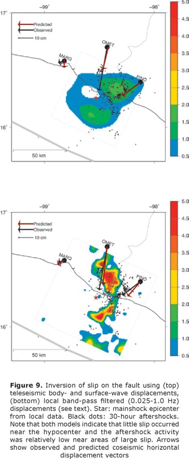 Immediately after the earthquake, teleseismic body and surface waves were inverted to map slip on the fault by groups at NEIC and Caltech (http://eartquake.usgs.gov/earthquakes/eqinthenews/2012/usc0008m6h/finite_fault.php; http://tectonics.caltech.edu/slip_history/2012_Mexico/index.html). These inversions use the NEIC hypocenter (16.662°N, 98.188°W, H = 20 km; Table 2). The results show a compact, nearly circular source whose dimension can be approximated by a square area of 35 km × 35 km. As a consequence of using the NEIC hypocenter, in these inversions the slip patch is located well inland, far north from our epicenter. Here we use the same simulated annealing, wavelet domain algorithm used by NEIC (Ji et al., 2002a,b) to invert teleseismic body and surface waves for the slip on the fault plane. We use an expanded data set compared to the one used for the rapid solution by USGS: a total of 29 P-waves, 15 S-waves, 30 Rayleigh waves and 20 Love waves. We use th hypocenter determined in this study (Table 2). We invert for the magnitude, direction and duration of slip at each fault is parameterized by an asymmetric cosine function (Ji et al., 2002a). The timing of the initial slip is constrained to follow a rupture volicity of 3 km/s. First the body-wave arrivals were aligned on theoretical travel times based on a 1D Earth model. However, we found large apparent time shifts between observed and calculated seismograms, caused by the 3D structure of the Earth. The systematic variation of these shifts with azimuth is probably also responsible for the large mislocation of the hypocenter by global agencies, mentioned above. To minimize the effect of unmodeled 3D structure on the result, we manually aligned the body-wave phases on the first observable arrival in the seismogram. At stations where we could not identify the first arrival, we aligned them to be consistent with neighboring stations. The alignment of the traces is a difficult task as the first arrivals are small relative to the noise level at many stations. Furthermore, comparing the teleseismic waveforms to the ones observed locally we found that the initial weak rupture (see more detail in the following section) was not seen in any of the teleseismic records. To account for this small initial slip near the hypocenter, we shifted all the traces by two seconds. The distribution of slip on the fault plane determined by the inversion is shown in Figure 9a. There are two separate regions of slip, both to the East of the hypocenter, one updip and the other one downdip. Each area of slip is about 30 km in diameter and a maximum slip of almost 2 m. It should be emphasized that this is a preliminary solution and that the pattern depends critically on the alignment of the body waves. The solutions we obtained using unaligned seismograms, as well as aligned but not shifted by a constant, have one patch of slip to the north of the hypocenter, similar to the solutions of the groups at NEIC and Caltech. The shift of two seconds is what allows the rupture to get further from the hypocenter before the large slip occurs, in effect allowing two different slip patches. Allowing a much smaller rupture velocity at the beginning could alter this result. However, we note that the two-patch slip model predicts static displacements that are in better agreement with those observed at nearby GPS stations than the one patch model and it is also in better agreement with the slip model obtained from regional data (following section).