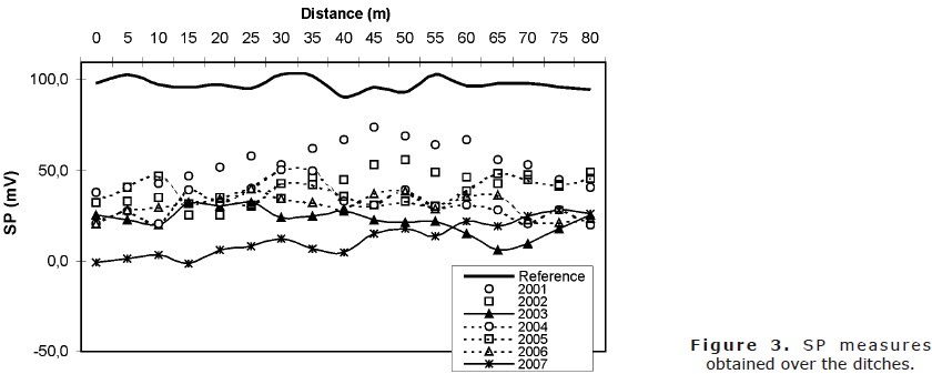 The measurements on the 2007 ditch present relative lower values, with extreme measures between -1mV to 28mV. The ditches in 2006, 2005 and 2004 present higher values, with extremes measures between 20mV and 48mV.