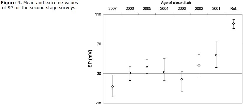 The acquired data indicate more negative values in the ditches closed between 2007 and 2006 (0mV to 10mV), and widespread occurrence of values between 10mV and 30mV in ditches closed between 2005 and 2004. Measures between 30mV and 70mV occur in ditches closed between 2003 and 2001.