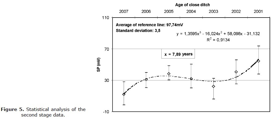 Statistical analysis of self-potential average values measured on the waste ditches indicates the period of 8 years to return to the natural values, from the first year of closure (Figure 5).
