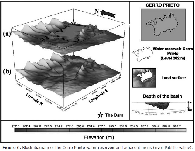 According to CNA reports the maximum water storage of the Cerro Prieto water reservoir is 393 million of cubic meters, which corresponds to a water level of 285 meters above sea level (a.s.l.) (see Table 1, volume CNA). However, this level was reached only three times after the dam's construction. Hurricanes Gilbert (1988), Keith (2000), and Emily (2005) contributed to reach the full capacity storage of the dam.