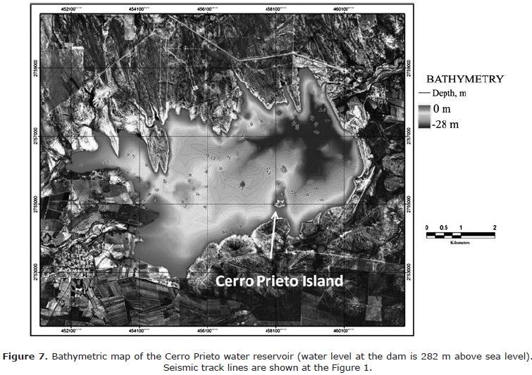 A chain of islands is located in the central part of the water reservoir. The large island called the Cerro Prieto Island, and rises up to 25-30 m above the surrounding bottom floor near the south coast (Figures 7). Another one situated to the west-northwest and has a single pointed peak. An area of four small islands occurs to the north of the Cerro Prieto Island, topographic high which divides the water reservoir into western and eastern areas.