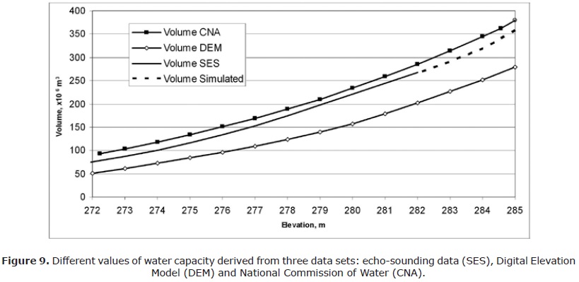 The volume capacity values (Figure 9) derived from the analysis of the bathymetric map (Figure 7) indicate a predicted total storage capacity of 360 million m3 (Table 1), whereas the storage capacity generated from DEM shows only 279 million m3. This discrepancy could be explained by the fact that the Digital Elevation Model was developed in the early 80-ies before the dam construction and excavations of the basin material as reported by De León (1993) (Figure 4).