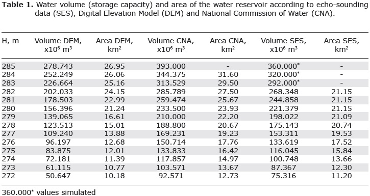 Table 1 shows summary data of the water storage of the lake and the surface area of the reservoir for different water levels, calculated according to the Digital Elevation Model (DEM) and SES echo-sounding data. The procedure comprises a standard hydrological modeling (implemented in Arc/Info) that is a cell-based modeling of water depth and storage volumes (Stout et al., 1985). In both procedures the Digital Elevation Model for Linares and surrounding areas from INEGI (Instituto Nacional de Estadística, Geografía, e Informática) was used. Grid node spacing was 30 x 30 m.