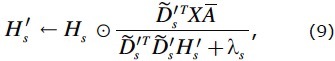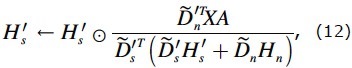 is the Euclidean column-wise normalization of the dictionary to prevent joint numerical drifts D's in H's and (Eggert and Kórner, 2004), 1 is a suitable size square matrix of ones and A is the activity diagonal binary square matrix, explained in more detail in the discussion section. The parameter λs determines the degree of sparsity in the code matrix. The trained preliminary dictionary of target source D's is the a priori knowledge to learn the noise dictionary Dn, which can be trained directly from selected time sections of the available noisy signal using a constrained sparse NMF (NMF*) model estimation, so that only Dn, Hn and H's are estimated, while d' is predefined and left unchanged by the following updating equations until convergence: