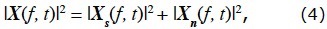 where the observable signal x(t) and the sources s(t) and n(t) are transformed into a complex time-frequency representation X(f,t), Xs(f, t) and Xn(f, t) respectively. The most commonly used time-frequency representation is the Short-Time Fourier Transform (STFT) which transforms a discrete time signal into a complex spectrogram.