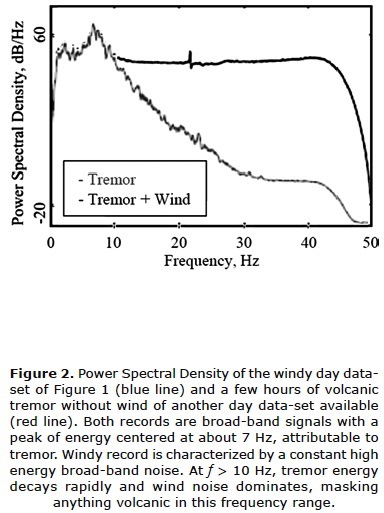 In the present case study of Villarrica volcano, this strategy is not directly applicable. In fact, our data-set is characterized by a relatively continuous "volcanic tremor", our source of interest, immersed in a relatively transient "wind" noise that we want to suppress. Wind components change rapidly in time and wind gusts can show very high energy, with comparable or greater energy than the volcanic tremor background, which is always present. This implies that we have no samples of pure "wind" noise for training. Both tremor and wind are non-stationary broad-band sources, with overlapping components in time and frequency as in the daily data-set shown in Figure 1. Focusing our attention to power spectral density of a windy day and a few hours of tremor signal registration without wind present, we recognize that most of the energy overlaps in the low frequency range, while high frequency range is dominated by wind components, as depicted in Figure 2. Our final task is to reduce wind noise in single-channel volcanic seismic recordings by means of a classical refiltering technique as suppression rule, such as a Wiener one (see Figure 3).