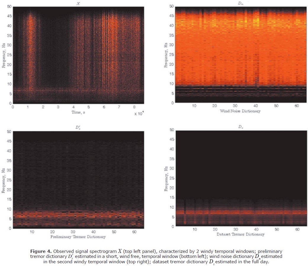 In order to estimate the preliminary target dictionary D's, we analyze several 1 day records (8.64 Msamples@100Hz sampling frequency) to catch some temporal frames without wind, as at 5 hrs of Figure 1, where Power Spectral Density is similar to the red line of Figure 2. It is evident that a major requirement for the method to work properly is the availability and the recognition by the user of a time period for which there is only "source" signal, i.e. without wind contamination. This training period should be chosen by careful examination of the spectral content time evolution and/or, if available, using additional data such as datasets from pressure sensors, microphones, infrasound sensors or anemometers. Visual spectrogram screening can be a subjective and an error prone selection activity which must be taken in account and reduced adopting a statistical estimation algorithm, in figure 3 we call it Statistical Foreground Activity Detector, which detect and flag the active frames (if frame t is active: Att = 1, otherwhise 0), implemented as a time-recursive averaging algorithm based on signal-presence uncertainty, similar to statistical Voice Activity Detector (VAD) used in speech enhancement methods (Cabras et al, 2010). With the selected temporal frames we apply a sparse NMF to preliminary train the tremor dictionary shown in bottom left panel of Figure 4. This pre-estimated source model is then used to estimate the wind noise dictionary applying a sparse NMF* learning algorithm on a strong windy day data-set; the resulting Dn is depicted in the top right panel of Figure 4. This is a definitive wind noise dictionary for our data-set and is very important to prevent volcanic tremor components amongs Dn components. The further learning step (BL in Figure 3) was applied to all records of the data-set to estimate Ds, Hs and Hn and estimate the tremor source spectrogram (Eq. 7) and the noise source spectrogram (Eq. 8). Figure 5 shows the estimated spectrogram sources of a full day recording. The dataset tremor dictionary Ds is shown in the right bottom of Figure 4. It is similar to but smoother, depending on more data frames, and it differs greatly from Dn although it points out some frequency superposition.