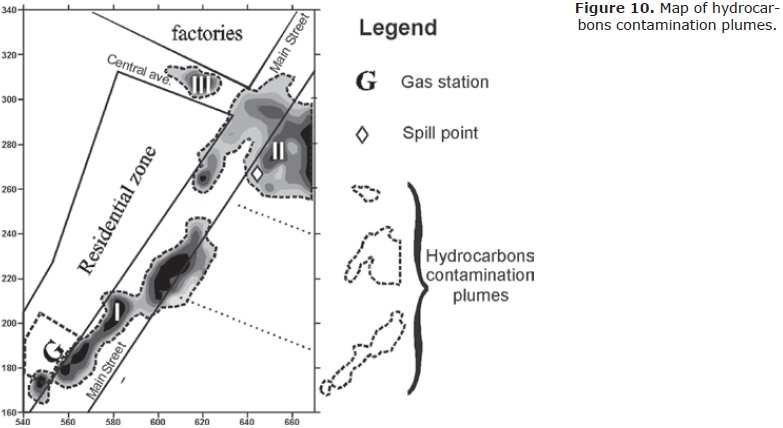 The affected area by hydrocarbons can be separated in three plumes with different type of contaminants: Plume I, with recent release of regular gasoline, which is connected with the gas station as active contamination source; Plume II corresponds, according to geoelectrical and BTEX analysis results, to mature (weathering and biodegradation) hydrocarbons contamination due to regular unleaded gasoline released within the last one to five years; and a small Plume III, not related with the other two plumes mentioned above, caused by pouring of solvents and white gas on soil.
