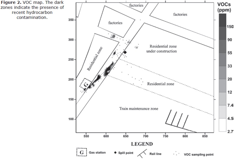 Fresh gasoline contamination presents high VOC (> 20 ppm) concentration. Low VOC (< 20 ppm) values could indicate the presence of clean soil or soil contaminated by mature hydrocarbons. Figure 2 shows some plumes with high VOC concentrations (dark zones, Figure 2), indicating the presence of fresh contaminants in the subsoil; one of them possibly related to the gas station.