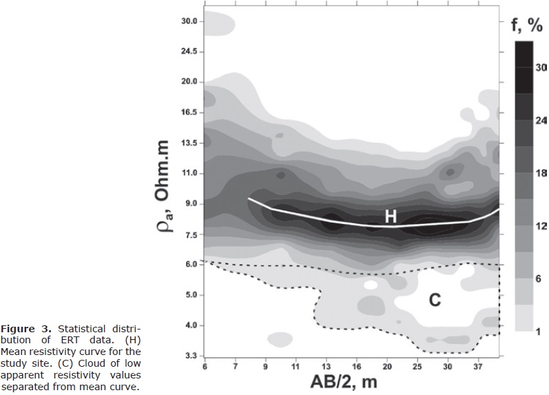 Figure 3 shows the statistical distribution (apparent resistivity vs. AB/2 distances) from 64 ERT measurements points. The legend represents the occurrence frequency values. In general, the apparent resistivity values are below of 20 Ohm.m, even in the vadose zone (minimal depth of GWT is 3.75 m), which means the clay content in soil is significant at different study depths. The mean curve (curve H, Figure 3) characterizes the subsurface up to 15 m depth by a three layer curve (type H) with low resistivity contrast. In most of the SEV, the resistivity decreases from 10 to 7.8 Ohm.m (first and second layer) which marks the transition from a semi-saturated to saturated clayey sediments, respectively, followed by a third layer (AB/2 > 30 m) with lower clay content (ρa ~ 9 Ohm.m). Apparent resistivity values below 6.4 Ohm.m are outlined in a cloud of data (dashed line contour, zone C, Figure 3), indicating the presence of low resistivity anomalies (mature contamination) for some ERT points, mainly for AB/2 > 10 m or study depth ≥ 5 m (second layer).