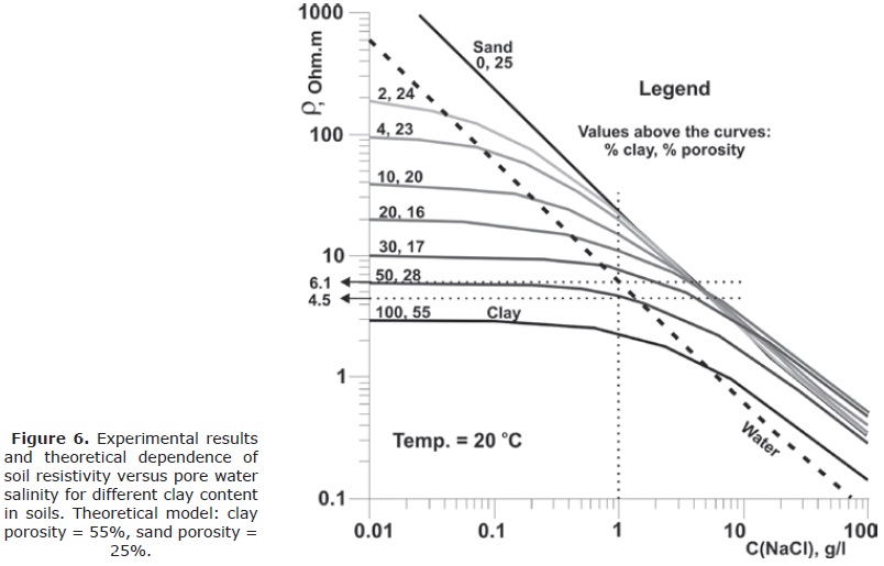 In Figure 6 the results of theoretical calculations with the "PetroWin" software are shown. Soil resistivity is considered as a function of water salinity (NaCl content at 20°C). Soil resistivity curves for different sand and clay proportions are displayed: curve for sand (in the upper part of Figure 3A, 0% clay, and 25% porosity) and curve for pure clay (in the lower part of Figure 3A, 100% clay, and 55% porosity). Water curve (dashed curve) gives us the relation between water resistivity and water salinity; while the vertical dotted line represent the groundwater salinity mean value of 1 g/l for the study area. Two horizontal dotted lines show the resistivity range 4.5 Ohm.m to 6.1 Ohm.m for soils with clay content between 37% -50% and pore-water salinity 1 g/l, being 4.5 Ohm.m the geoelectric boundary between clean and contaminated soil. Resistivity values less than 4.5 Ohm.m correspond to mature oil contaminated soils; however, low levels of hydrocarbons contamination may be present in soils with resistivity values within the aforementioned resistivity interval. Resistivity values greater than 6.1 Ohm.m indicate that there is no mature contamination.