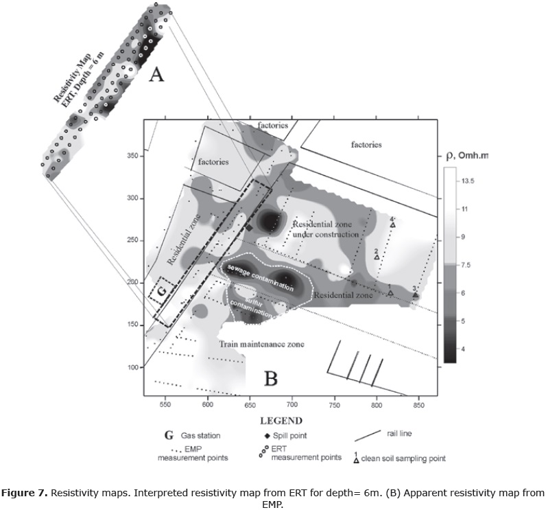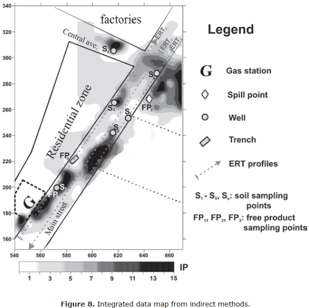 The gas station is topographically located at an up gradient from the spill present in the nearby apartment construction. Therefore, gasoline released from buried pipeline would migrate toward the apartment construction area. Mature contaminated zones were defined by ERT and EMP methods as low resistivity anomalies. The ERT, EMP and VOC results were integrated on a map, allowing the final configuration of contamination plumes and the optimization of drilling and soil/free-product sampling.