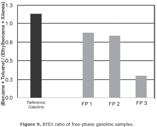 BTEX ratio of free-phase gasoline sample FP3, collected in the spill point (Figure 8) reached a value of 0.32, as shown in Figure 9. The significant decrease of BTEX ratio on free-phase in sample FP3 implies a weathering by solubilisation, water washing or biodegradation process. Weathering and BTEX ratios imply that gasoline was transported to the water table and did not undergo substantial alteration during its vertical migration in the soil. Hence, a thin layer of free product was carried through sand lenses to the impermeable clay stratum. Therefore, when advanced alteration of the pattern has occurred due to environmental exposure, it is difficult to estimate, by composition of the free-phase, when the fuel was released. Lead and lead alkyls were absent in the free-phase sample, and is worth noting that regular unleaded gasoline was introduced in 1992.