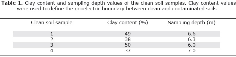 Taking into account the existence of high clay content in the subsoil and the characterization of mature hydrocarbon contamination as low resistivity anomaly, we need to define the geoelectric boundary between clean and contaminated soil. For this purpose, we used in the present work a conductivity model for unconsolidated formations and the "PetroWin" software for calculation of the soil resistivity developed by Ryjov and Shevnin (2002). This model considers the geometrical microstructure of the components as well as electrochemical processes occurring in the soil for a wide range of the pore-water salinity and clay content. Once groundwater (or salinity) and soil resistivity are known, clay content and porosity are estimated for clean soil, and the geoelectric boundary is defined. The characteristics of the conductivity model, the procedure to determine the groundwater (from in-field measurements) and soil (from lab measurements) resistivity, and the equations for calculate the soil petrophysical parameters (including clay content and porosity) are explained in detail in Shevnin et al. (2006; 2007) and Delgado-Rodríguez et al. (2012).