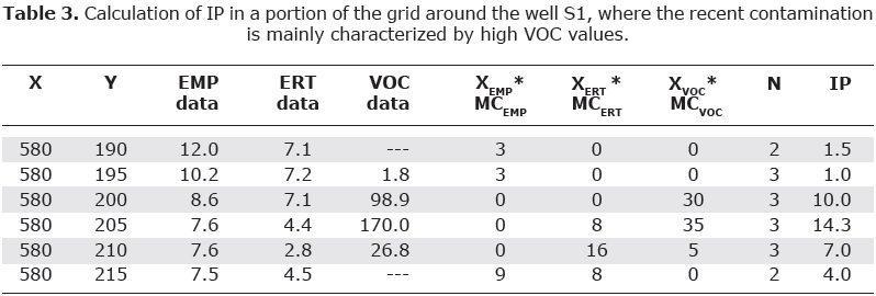 The parameters or variables that integrate the map are: gas concentration (VOC) in ppm, true resistivity (ERT) in Ohm.m and apparent resistivity (EMP) in Ohm.m. Each variable, depending on the values range, generates a weight (or degree of reliability, Xij) of the anomalous zone. The obtained values of the indirect methods (ERT and EMP) receive weights between 0 and 5, while VOC, considered as semi-indirect method, their values receive a weight range between 0 and 7 (Table 2). Based on the petrophysical modeling performed in clean soil samples (Table 1, Figure 6), the ERT interval 6.1 Ohm.m ≤ ρ <14 Ohm.m gets weight 0 since it is not related to the presence of neither fresh or mature contaminant but rather is the sediments resistivity range of the site, while the other weights values are distributed as follows: 3 to 5 and 1 to 2, for low (high resolution) and high (lower resolution) resistivity anomalies, respectively. In a similar manner, based on the correspondence between apparent resistivity and interpreted resistivity maps (Figure 7), EMP (apparent resistivity) values receive weights 1 and 2 to high resistivity anomalies and 3 to 5 to low resistivity anomalies. Taking into account the statistical distribution of the apparent resistivity values of the Figure 3, the interval 7.5 Ohm.m ≤ ρa < 9.5 Ohm.m receives weight 0. The index for VOC varies between 1 and 7 depending on the increase of VOC value from 20 to 179 ppm. VOC values less than 20 ppm will have weight 0 (Table 2).