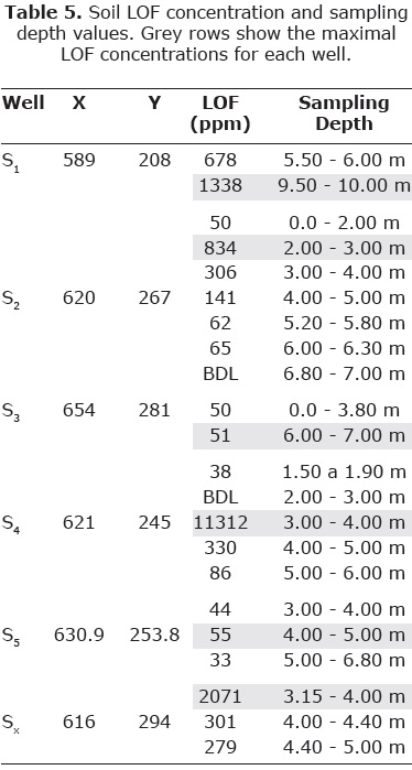 Using the integrated map (Figure 8), the drilling activities were conducted to the specific contaminated areas. Using a Geoprobe System (Figure 5), six monitoring wells were drilled up to 10 m of depth in strategic and topographic relevant points, taking into account the urban infrastructure and the access level to each point. Twenty two soil samples (Table 5) were collected in monitoring wells S1-S5 and Sx, (Figure 8). The analytical results revealed an irregular distribution of LOF depending on the depth ranges from bellow the detection limit to 11312 mg/kg. The maximal concentration (11312 mg/kg) of the site was detected in S4 in the interval of depth 3 to 4 m. In well S1, a concentration value of 1338 mg/kg was determinate for interval of depth 9.5 to 10 m, corresponding to the GWT depth in the southern end of the site. Other noticeable concentration value (834 mg/kg) was determinate in well S2 (Table 5). On the other hand, the well Sx shows significant value (2071 mg/kg) of LOF in sample of soil collected near to ground surface (depth ~1.2 m), as evidence of contamination by hydrocarbons poured on the terrain. LOF was very low in wells S3 and S5 (Table 5).