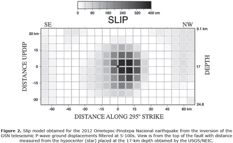 Se aplica un procedimiento de inversión de falla finita para obtener un modelo de deslizamiento sobre el plano de falla para el sismo MW 7.4 de Ometepec-Pinotepa Nacional del 20 de marzo 2012, utilizando ondas P telesísmicas registradas por la red del Global Seismographic Network. La inversión se hace en tiempo casi-real utilizando parámetros de la fuente reportados por el Servicio Geológico de Estados Unidos (USGS) y el proyecto del Global Centroid Moment Tensor (gCMT). La orientación de la falla y el ángulo de deslizamiento se obtienen del mecanismo del gCMT, asumiendo que la falla coincide con el plano nodal con bajo ángulo de buzamiento. Las dimensiones de la falla y la duración máxima de la función fuente se definen en base a la magnitud reportada para el evento. Datos telesísmicos obtenidos de la base de datos del Continuous Waveform Buffer del USGS se utilizan en la inversión con tiempos de inicio que corresponden a los arribos de la onda P implementados en el cálculo del hipocentro. La inversión se estabiliza aplicando una transición suave de deslizamiento a lo largo de la falla y una reducción simultánea del momento sísmico. Estas restricciones se implementan utilizando un peso de suavizamiento estimado directamente del problema inverso, permitiendo así la recuperación en un solo paso del patrón de ruptura menos complicado. La inversión de los registros en desplazamiento revela una simple ruptura circular similar al área de deslizamiento determinada por el USGS utilizando ondas de cuerpo y ondas superficiales, indicando que las ondas P telesísmicas pueden identificar los rasgos principales de la fuente en tiempo casi-real. Inversiones adicionales realizadas utilizando registros en velocidad identifican una fuente más detallada que cubre una zona elíptica de 2500 km2 y que se extiende hacia arriba y hacia abajo del hipocentro a lo largo de la falla. Esta zona elíptica tiene dimensiones que cubren el área definida por dos fuentes separadas determinadas por otros investigadores utilizando datos locales y ondas sísmicas globales. Los resultados indican que los registros en velocidad podrían aportar mayor información sobre los detalles de la ruptura en inversiones realizadas en tiempo casi-real utilizando ondas P telesísmicas.