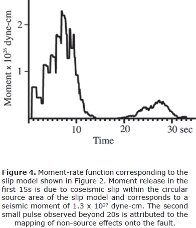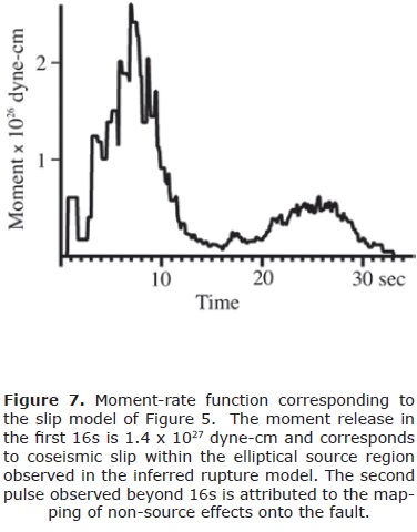 The moment-rate function obtained using the instrumental velocity records (Figure 7) shows a 16s pulse with a seismic moment of 1.4 x 1027 dyne-cm that corresponds to the elliptical source area of Figure 5. This source duration and seismic moment are consistent with those identified for the circular slip region in the near-realtime inversion of the deconvolved displacement records. The lower-amplitude pulse observed beyond 16 seconds in the moment-rate function corresponds to slip mapped onto the outer portions of the fault due to the fitting of unmodeled effects in the observed waveforms.