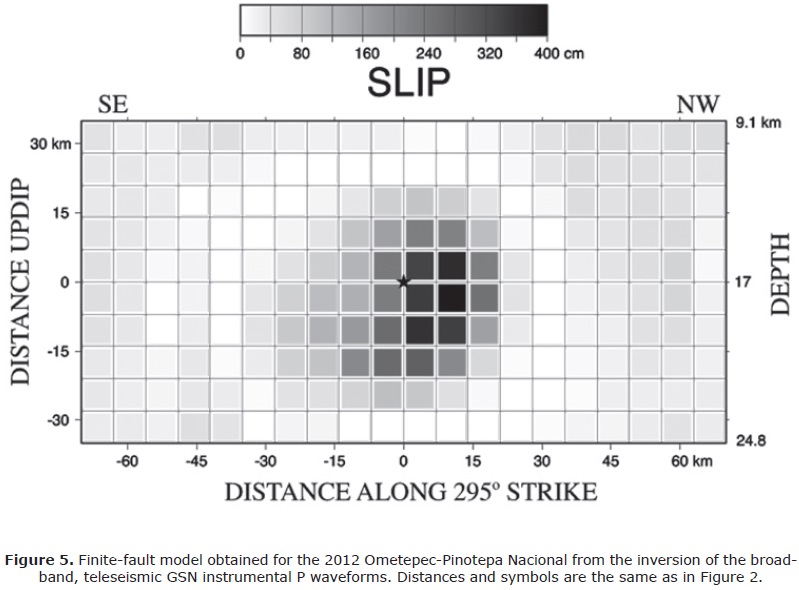 With this in mind, we perform a second finite-fault analysis of the 2012 Ometepec-Pinotepa Nacional earthquake using the instrumental BHZ waveforms recorded at the 26 GSN teleseismic stations with record start times set to the USGS/NEIC P arrival times. These records correspond to velocity and are given in counts/second in the CWB database. In this case, instrument responses are added to the subfault synthetics rather than deconvolved from the observed records, and both observations and synthetics are interpolated to a common time step of 0.25s prior to inversion. The resulting slip model (Figure 5) shows a more elliptical source with slip extending updip and downdip from the hypocenter.