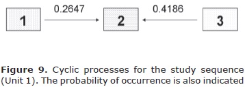 The difference <D> matrix indicates cyclic transitions just from sandstone to siltstone and from shale to siltstone (see figure 9). The transitions not present in the diagram could be considered as random changes of the sedimentation processes or non cyclic transitions (Miall, 1973).