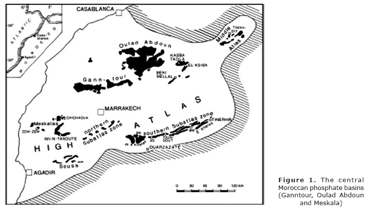 The Ouled Abdoun basin is the largest phosphate basin in Morocco. It's located about 100 km in south-east of Casablanca. The phosphate deposits of Ouled Abdoun area belongs to the western Moroccan Meseta, commonly considered being stable. The local sedimentary deposits resulting from a large transgression occurred in mid-Cretaceous. It consists of (Kchikach et al., 2002; Bakkali 2006) : marly limestone and gypsum of Cenomanian, Turonian white limestones, Senonian marl and yellow marly limestones, phosphatic series dated from Maastrichtian to Ypresian and Lutetian calcareous Thersitean slab. The Neogene continental deposits cover locally the marine series.