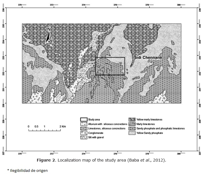 En la cuenca de Sidi Chennane en Marruecos, existen inclusiones estériles de caliche que dificultan la extracción de las rocas fosfatadas y que son difíciles de detectar. La resistividad de los caliches excede un valor de 200 Ω-m contra 150 Ω-m para la roca fosfatada. Se realizó un trabajo de prospección eléctrica de tipo Schlumberger en una zona de 50 ha en la cuenca de fosfatos de Oulad Abdoun. Se obtuvieron modelos del perfil geológico mediante el filtro de SavitzkyGolay, y se logró localizar las inclusiones de caliche y las estimaciones de cálculo de las reservas de los fosfatos se encuentran muy circunscritas.