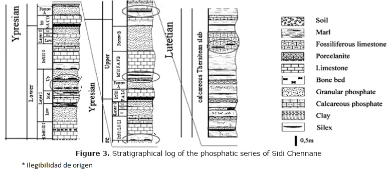 The loose phosphatic Levels exploited are cited according to their succession (Kchikach et al., 2002; Bakkali 2006) Layer III: Maastrichtian, Layer II: Paleocene, Layers I and 0, "forrow" A and B: Ypresian. They are typically separated by phosphatic indurated limestone benches, more or less important and more or less regular called "infill", II / I layers infill, III / II layers infill, etc.