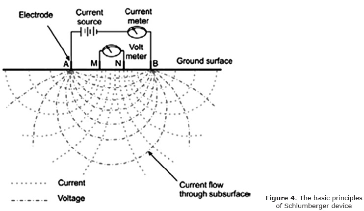 Electrical sounding is a method to investigate the change in earth resistivity with depth at a particular location. Horizontal electrical profiling is a method to determine lateral variations in earth resistivity within a limited depth range. Traditionally, arrangements using four electrodes (two current-transmitting electrodes and two voltage-sensing electrodes) are used for either vertical soundings or horizontal profiling. For vertical soundings, the electrodes are arranged symmetrically according to a center, with increasing distances between electrodes used to explore deeper depths. In the profiling mode, the distance between the potential and current dipoles (a dipole consists of a pair of like electrodes) is maintained while the array is moved along the profile line for mapping lateral changes (Chouteau, 2001; Ouadif et al., 2012; Baba et al., 2014).