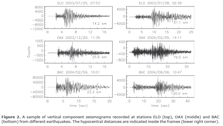 All stations of the RESNES network (Table 1; triangles in Figure 1) are autonomous and consist of Kinemetrics digital recorders (model K2) with an internal triaxial force-balance accelerometer registering three components of ground acceleration and have a built-in Global Positioning System (GPS) timing system. A vertical-component short-period sensor (model L4C) is connected to a fourth recording channel. These stations record local and regional events with a rate of 200 samples per second. Figure 2 shows velocity records from a sample of six earthquakes recorded by three stations (ELO, OAX, and BAC) at different epicentral distances. These well-recorded seismograms show clear P- and S-wave arrivals and a high signal-to-noise ratio for both, local and regional distances.
