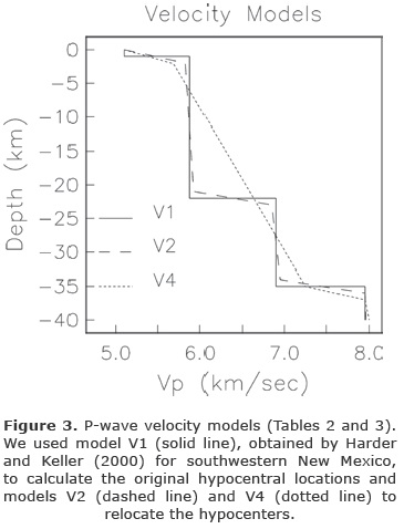 The SSST method was implemented by Lin and Shearer (2005) in their COMPLOC earthquake location code. I relocated the initial dequarried hypocenters, obtained with Hypoinverse, with a modified version of COMPLOC that permits to include regional phases (Pn, Pg, Sn, Sg) and weights the phase arrival picks according to the source-station distance. For this relocation I used the same procedure and velocity models (V2 and V4 in Figure 3) as Castro et al. (2010). These velocity models give smaller travel-time residuals than other velocity models tested by Castro et al. (2010). Models V2 (Table 2) and V4 (Table 3) consist of three and four layers, respectively, with small gradients to make the change of velocity with depth gradual. The P-wave velocity of the shallowest layer is 5.1 km/s, like in the V1 model by Harder and Keller (2000), and 7.95 km/s at the base of the crust (Tables 2 and 3). We divided the region into five rectangles, shown on Figure 4, to minimize regional variations of the velocity structure. One of the rectangles, northwest of the RESNES array, covers the area near Cananea; three rectangles cover the fault segments that ruptured in 1887; and the last rectangle, located in the southeast, covers the plateau of the Sierra Madre Occidental.