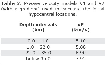 The initial epicentral coordinates and the source depth of the 504 events that had originated between 2008 and 2011 were calculated using the Hypoinverse computer code (Klein, 2002) and the P-wave seismic velocity model V1 (Figure 3 and Table 2) obtained by Harder and Keller (2000) from a wide-angle seismic north-south profile in southwestern New Mexico, close to the epicentral region of the 1887 Sonora earthquake. A very similar model was more recently obtained by Averill and Miller (2013) from an east-west seismic refraction/reflection survey along the New Mexico-Chihuahua border. Only events recorded by at least three stations with more than four clear body wave arrivals and (S-P) ≤ 25 sec were located. P and S wave arrival times were handpicked, with an approximate accuracy of one tenth of a second. Then the initial hypocentral locations were added to the nearly 600 local and regional events obtained by Castro et al. (2010) for the period 20032007. Figure 1 displays the 1107 epicenters located with Hypoinverse for the period 2003-2011. The smallest magnitude of the earthquakes located is 0.9; although not all the events with M>0.9 were located due to the restrictions described above. Subsequently, I dequarried this 20032011 initial catalog by removing daylight events (from 18:00 hrs UT to 06:00 hrs UT) and events with a focal depth shallower than 2 km, resulting a new catalog consisting of 300 earthquakes. To dequarry the initial catalog, event swarms near mines were identified based on the seismicity map reported by Castro et al. (2010). The boxes in Figure 1 delimit the extent of the swarms in the neighborhood of three main mines: Cananea in the northwest, Nacozari in the central part of the network and Mulatos in the southeast. Events inside those boxes that occurred from 18:00 hrs UT to 06:00 hrs UT were discarded.