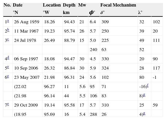 The 1997 earthquake was recorded by the local broadband station of TUIG (S -P time = 5 s) and by seven other broadband stations of the National Seismological Service (SSN), which were located at epicentral distances greater than 260 km. The reported coda-wave magnitude, M c , is 4.3. The epicenter of the event, given by the SSN, is 18.146°N and 94.499°W. However, its depth could not be constrained in the location. The epicenter and depth reported by the National Earthquake Information Service (NEIC), U.S. Geological Survey, is 18.017°N and 94.396°W and 33 km, respectively. This depth was fixed in the location of the earthquake.