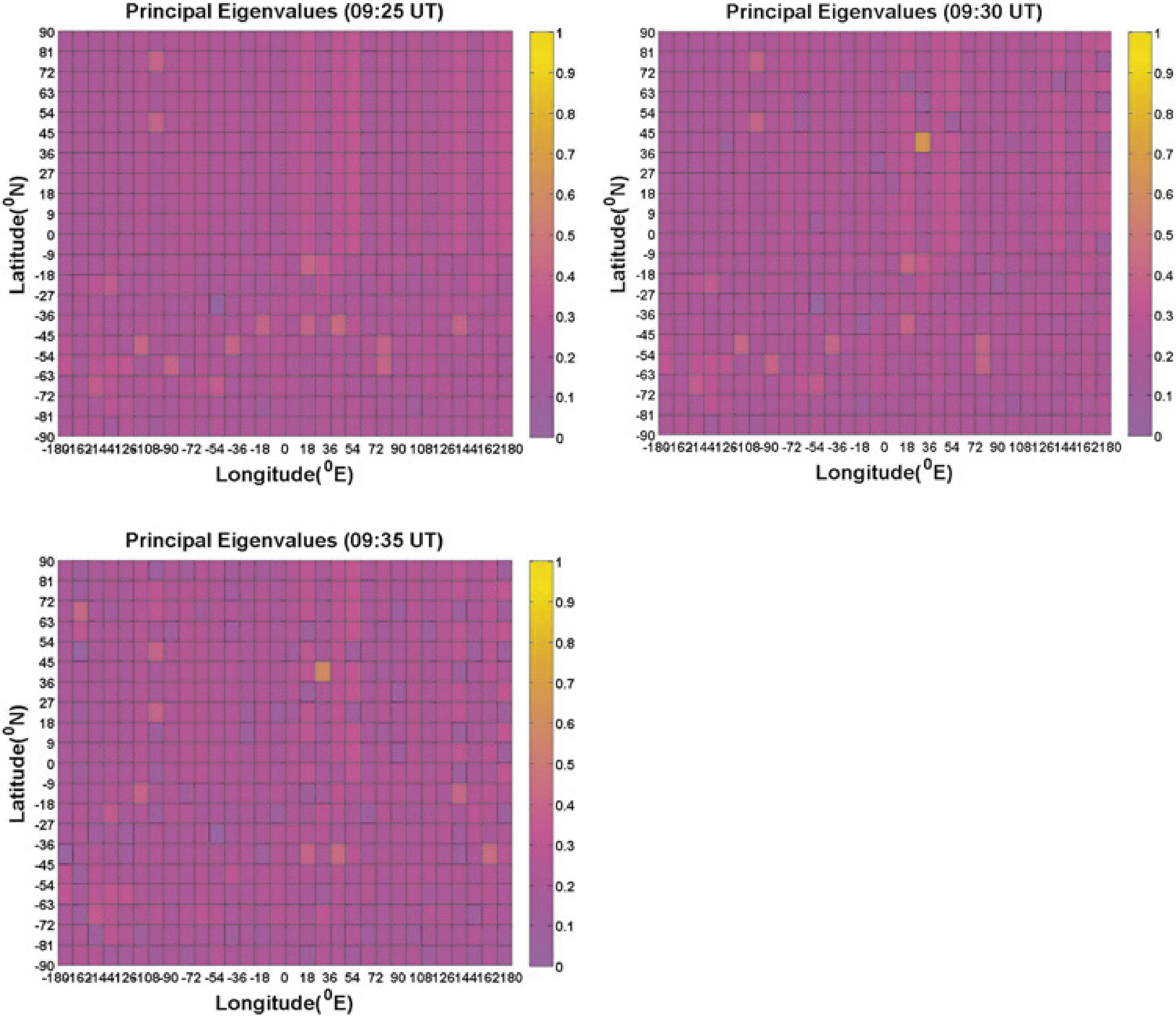 Figure 1(a) shows the GIMs during the time from 09:25 to 09:35. The earthquake-related TEC anomalies are not easy to observe using e.g. determining a running median of TEC content to detect a TEC anomaly (Liu et al ., 2006). The TEC data of the global region (not dividing the GIM for image processing) in Figure 1(a) are divided into 600 smaller areas 5 and 2.5 degrees in longitude and latitude, respectively. The size of each small area is 12° in longitude and 9° in latitude. The spatial resolution of the TEC data for GDGPS system is 5 and 2.5 degrees in longitude and latitude, respectively (Hernández-Pajares et al ., 2009; Chen and Gao, 2005; Gao and Chen, 2006) (http://www.gdgps.net/system-desc/references.html) and therefore 4 TEC data (two-dimensional data) are take in each area. The TEC were anomalies usually spread widely from the epicenters of large earthquakes from the results of Artru, et al . (2001) and Lognonné et al . (2006) and Hobara Parrot (2005). Therefore earthquake-related TEC anomaly is detectable for such selected size of an area. The 4 TEC data form a matrix A of Eq. 1 with the dimensions of 2 x 2 as small sample signal size (SSS) in each are of Figure 1(a). This allows for principal eigenvalues to be computed for each of the 600 smaller areas.