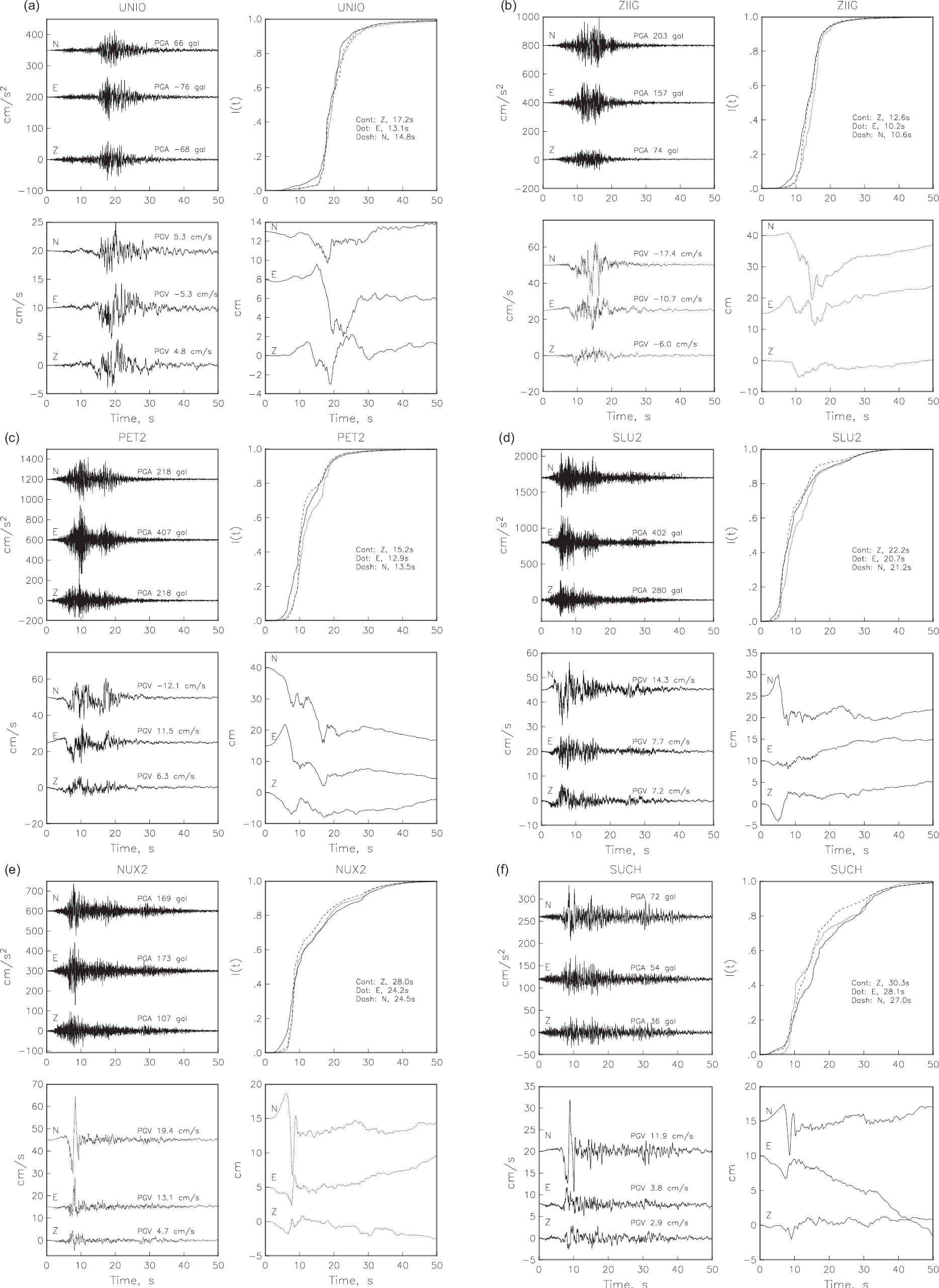 Figure 4 Acceleration, Arias intensity, velocity, and displacement at (a) UNIO, (b) ZIIG, (c) PET2, (d) SLU2, (e) NUX2, (f) SUCH, and (g) CAIG. Displacement was obtained from double integration of base-line corrected acceleration, without applying any filter.