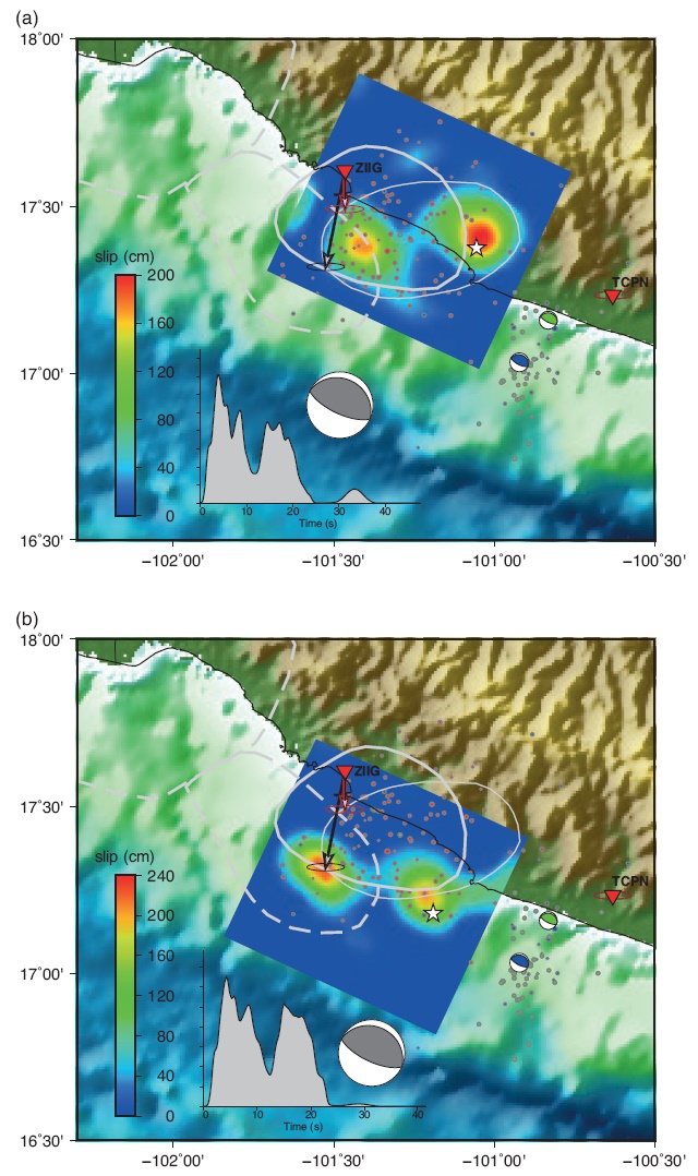 A comparison between the slip models obtained using the hypocenter determined in this study (Figure 6a) versus that reported initially by SSN (Figure 6b), shows that the relative location of the slip patches to the hypocenter and each other remains similar. However, the absolute location varies significantly. This shows how critical an accurate hypocenter location is.