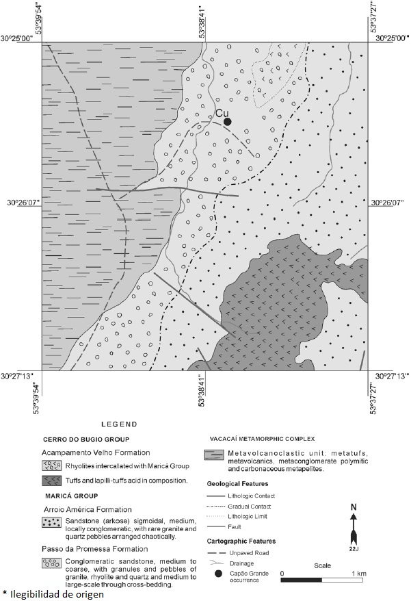 The study area consists in a cupriferous occurrence named Capão Grande, recognized by geochemical studies in stream sediments in research campaigns carried out by the National Department of Mineral Production (DNPM) in 1965. At first, the occurrence was considered by Bocchi (1970) as of no economic interest for mining due to small volume and ore content. However, the author highlighted the importance of conducting a detailed research in the region thanks to the favorable geological conditioning, porosity and fracturing.