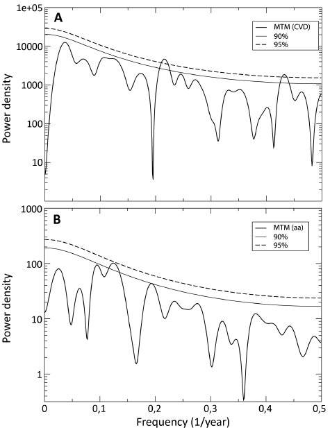 Figure 2 MTM spectrum analysis of CVD mortality rates at Kirovsk (A) and geomagnetic aa-indexes (B) over 1948-2010. The thin and dashed lines denote the 90% and 95% levels of significance respectively.