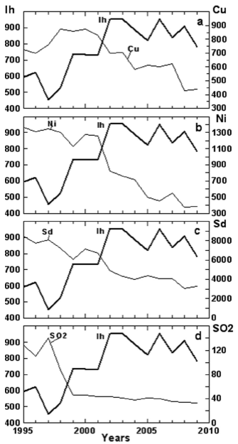 In this paper, the effect of air pollution on CVD mortality was assessed. Murmansk Oblast is one of the industrialized and densely populated regions of Russia. The world’s largest producer of phosphate-based fertilizers Apatit company is located in Kirovsk. Another largest Russian nickel-copper plant “Severonikel” is located in the town of Monchegorsk (67.9N, 32.9E) at a distance of 80 km from the town of Kirovsk. Figure 4 shows the variation of CVD mortality in Kirovsk and emissions of copper Cu, nickel Ni, sulfur dioxide SO2 and solid substance Sd from “Severonikel” plant for the period from 1995 to 2009 (Karnachev et al., 2014). It is clearly seen that any connection between CVD deaths and air pollution does not exist.