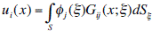 where: u i (x) is the ith component of the displacement at point x; G ij (x; ξ) denotes the Green’s function representing displacements produced along the i direction at x that are caused by applying a unitary force in direction j at point ξ; and ϕ j (ξ) is the force density in the j direction at point ξ.