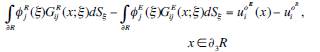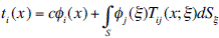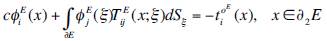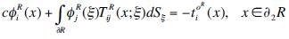 where: t i (x) is the ith component of traction, c=0.5 if x tends to the boundary S from the interior of the region, c=-0.5 if the variable x approaches to S from outside of the region, or c=0 if x is not at S. T ij (x; ξ) represents the traction from the Green’s function, which means the traction in the i direction at a point x due to the application of a unit force in the j direction at ξ on S. Green’s function for displacements and tractions are presented in Sánchez-Sesma and Campillo, (1991).